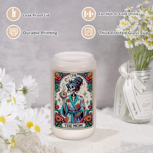 Fairy’s Gift Skeleton Mom Iced Coffee Cups, Cute 16 oz Frosted Glass Tumbler w/Lid Straw, the Mom Tarot Card Halloween Skull Cup, Mama Witchy Gifts for Women, Goth Bday Gothic Spooky Gifts for Mommy